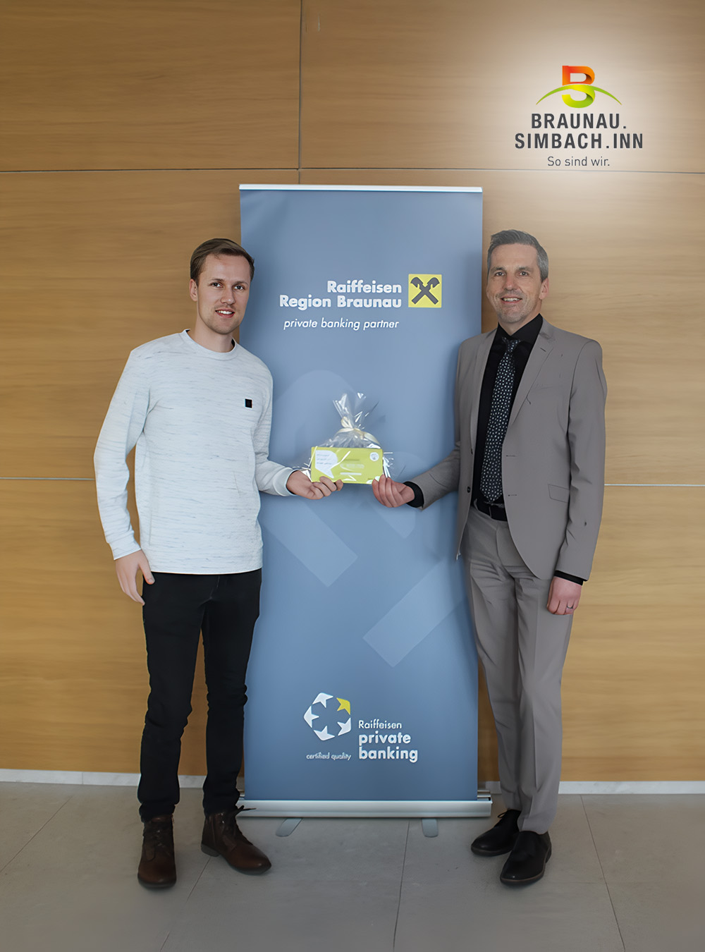Mit den besten Wünschen überreichte Herr Harald Kratzer von der Raiffeisenbank Region Braunau die Finde R Gutscheine im Wert von 600,00 EURO dem glücklichen Hauptgewinner.