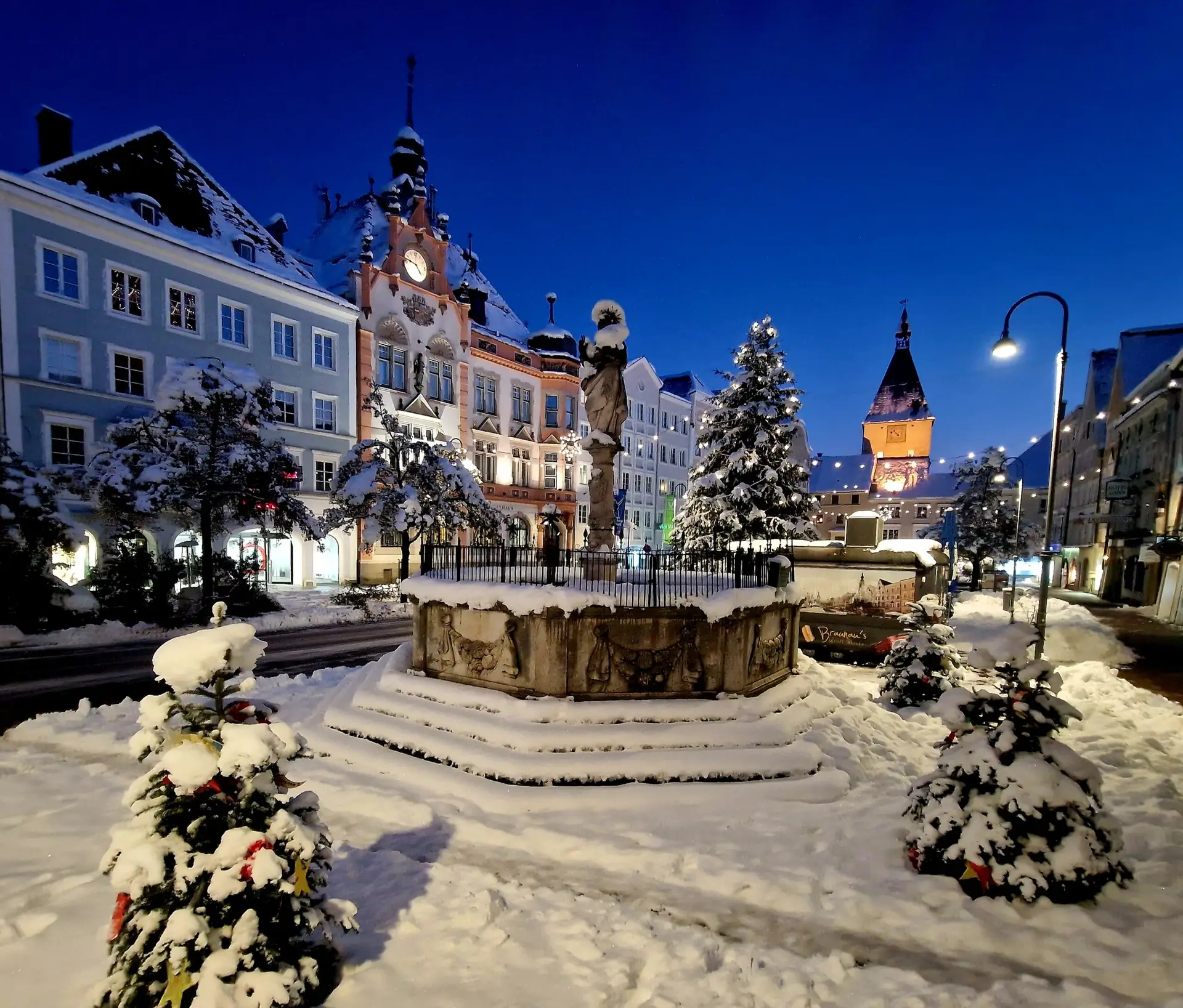 Es sollte ein weihnachtliches Ambiente (Motiv)aus den Städten Braunau oder Simbach im Hintergrund zu erkennen sein (Bsp: Weihnachtsbeleuchtung der Innbrücke, Schaufenster usw.)